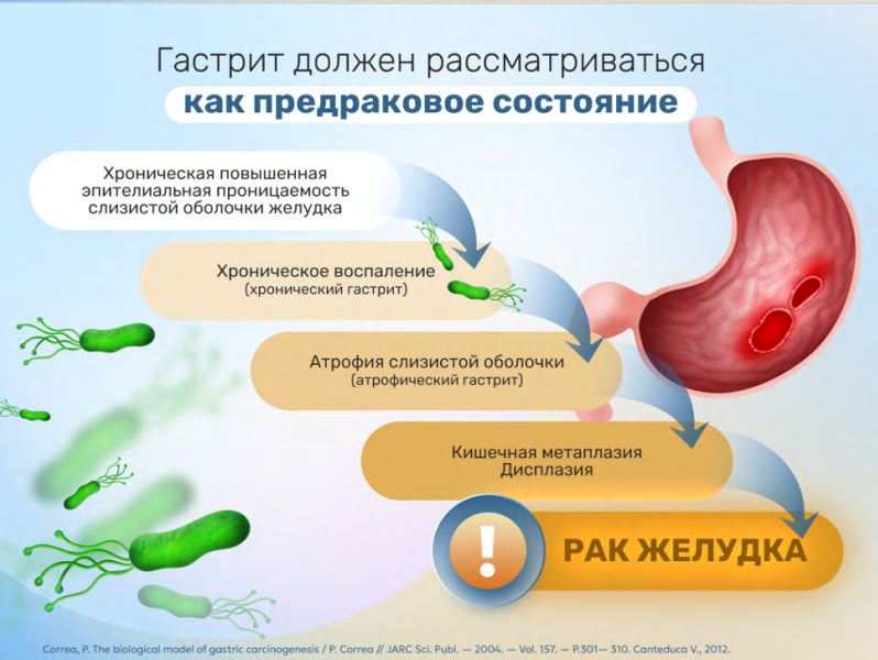 — Предраковое состояние определяется как состояние, при котором существует повышенный риск развития опухоли. Гастрит — это предраковое состояние, при котором риск развития опухоли зависит от таких факторов, как этиология и стадия заболевания, — говорится в тексте консенсуса.
