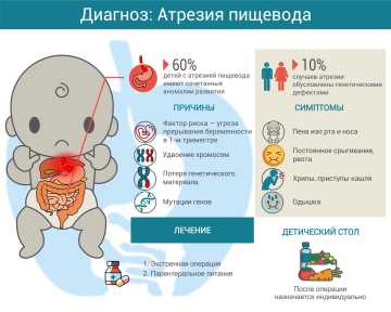 Генетически обусловленная атрезия пищевода, как правило, сочетается с тяжелыми пороками развития других жизненно важных органов, которые ведут к возникновению полиорганной недостаточности и в итоге к гибели больного.
