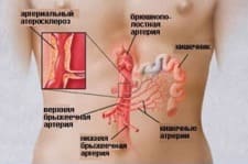 Важен факт того, что брюшная жаба возникает по истечении тридцати минут после еды или позже, локализация боли происходит с прогрессирующим течением заболевания. Человек может стремительно терять вес и происходит обезвоживание, вздутие живота и изменение цвета кожи не единственные признаки. Взаимосвязь с проблемами сердца очевидна, вызывает повышение артериального давления, прослушиваются систолические сосудистые шумы. На начальной степени заболевания проявляется мезентериальной недостаточностью, при которой наблюдаются боли в подреберье, запоры, метеоризм.