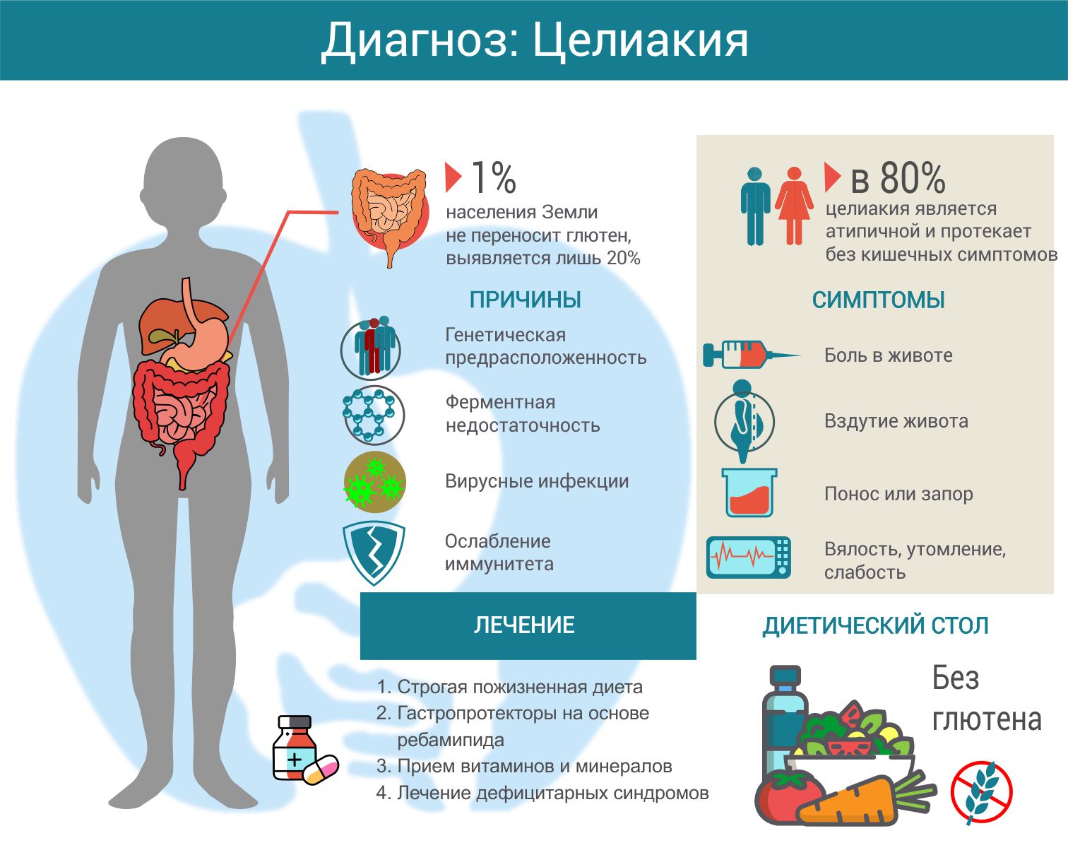 Целиакия — хроническое, генетически обусловленное аутоиммунное заболевание, которое характеризуется непереносимостью белков зерновых (глютена). Проявляется нарушением пищеварения и вызванными им расстройствами питания. Патологические изменения вызывают белки пшеницы — глиадины, ржи — секалины и ячменя — хордеины. Целиакия встречается примерно у 1% населения, чаще всего в скрытой или малосимптомной форме.