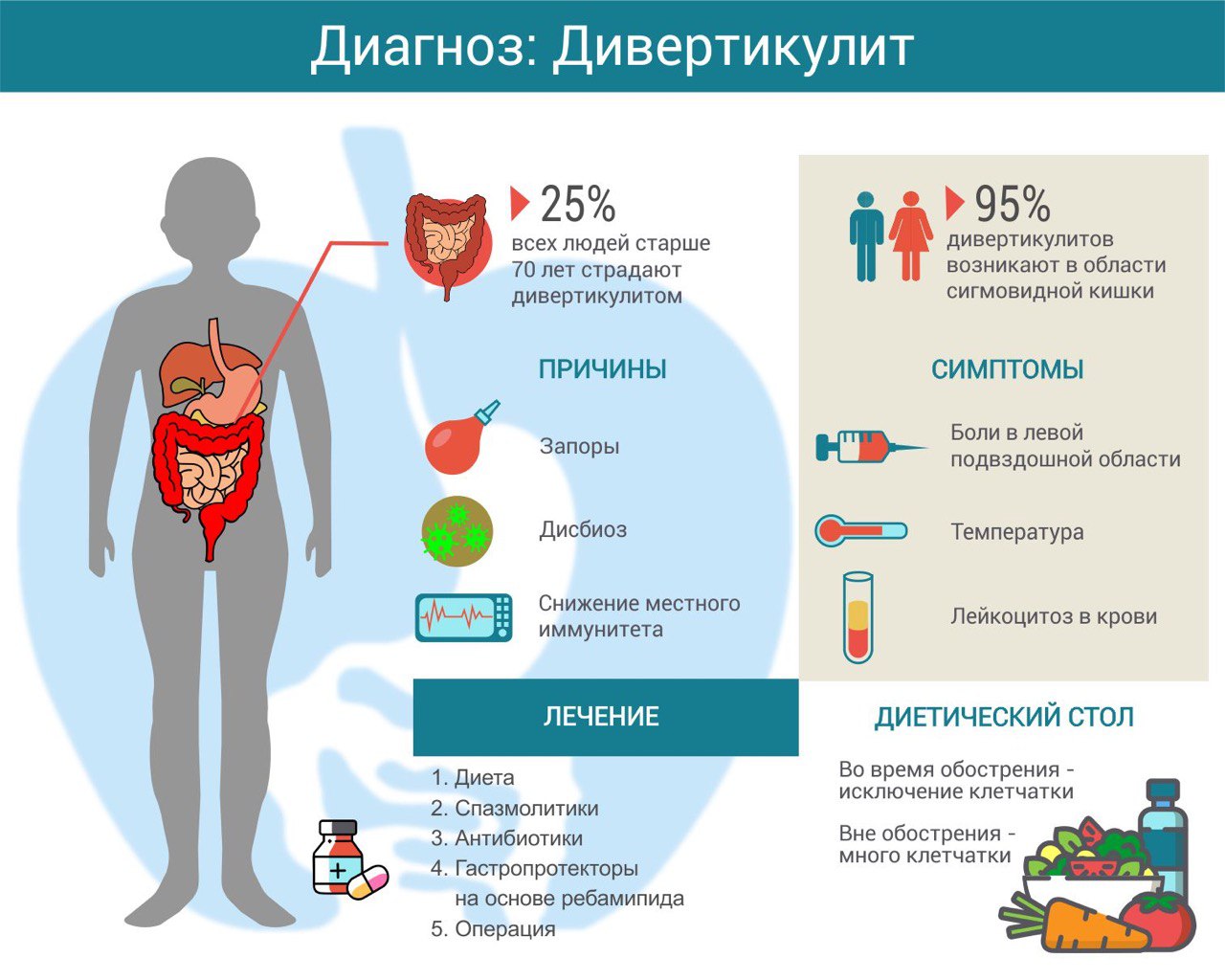 Заболевание тесно связано с возрастом: его обнаруживают лишь у 5% людей до 40 лет и у 25% людей старше 70 лет1 . В 90-95% случаев дивертикулит возникает в районе сигмовидной кишки.