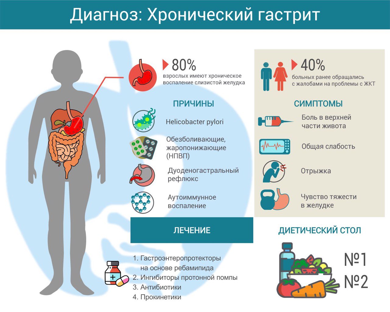 Лечение гастрита всегда комплексное. Пациентам назначают диету: стол №1 или 2 по Певзнеру (в зависимости от сохранения секреторной функции желудка).
