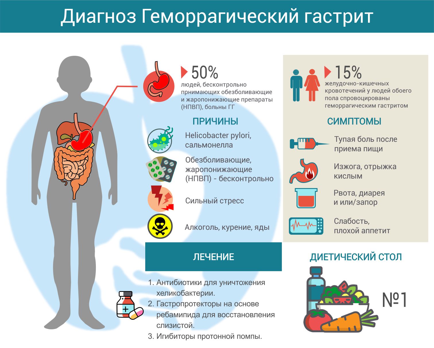 Основная жалоба при геморрагическом гастрите – тупые боли в животе после еды или употребления алкоголя. Возможны тошнота, отрыжка, неустойчивый стул. Из-за попадания крови в кал он становится черным; при обильном кровотечении стул разжижается. Если кровопотеря крайне массивна, кал может стать вишневого цвета – из-за того, что кровь раздражает слизистую кишечника, активируя перистальтику, и железо гемоглобина не успевает окислиться до черного цвета.