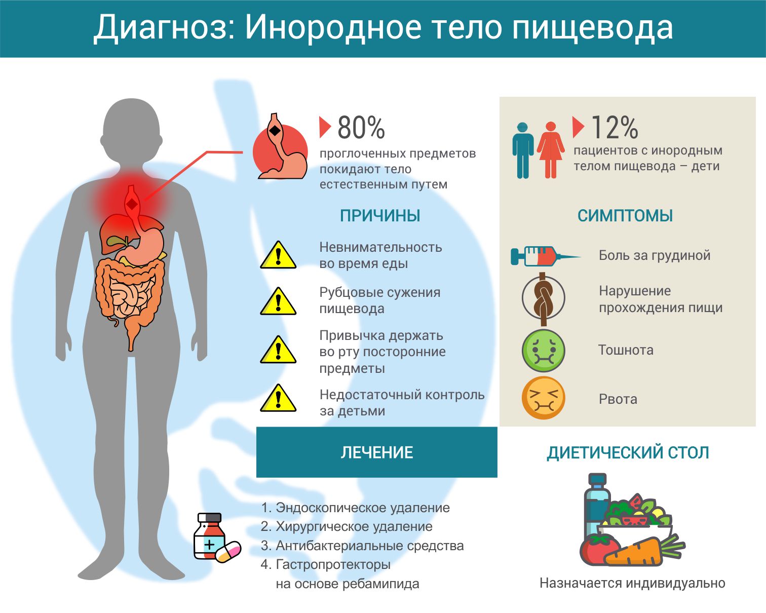 Инородное тело пищевода — это застрявшая в просвете органа еда или какой-то несъедобный предмет, проглоченный случайно или нарочно. Дети, которых среди пациентов с этой проблемой примерно 12%1, чаще всего глотают монеты, плоские батарейки-таблетки, магнитные шарики от конструкторов. У взрослых «ассортимент» разнообразнее: кости, зубные протезы, пакеты с психотропными веществами, гвозди, иголки.
