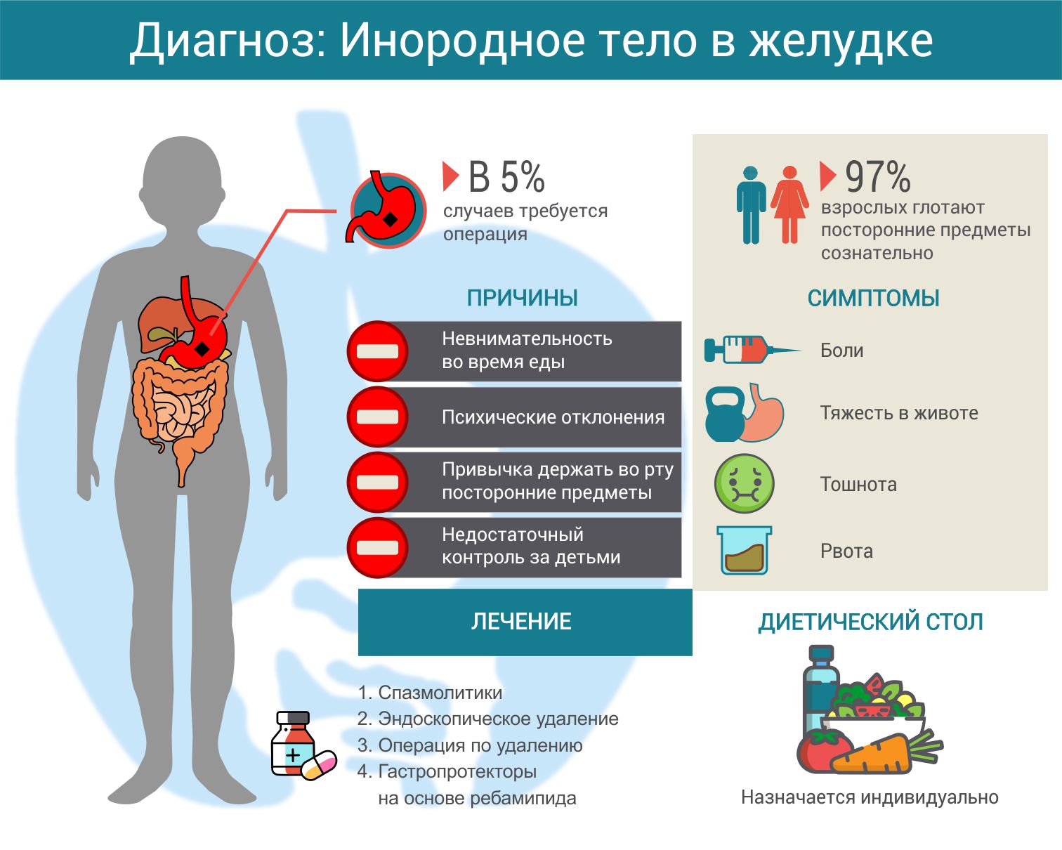 Если по каким-либо причинам эндоскопически удалить инородное тело не удается, делают операцию. После удаления инородного тела для ускорения регенерации слизистой оболочки рекомендован приём ребамипида (ребагит).