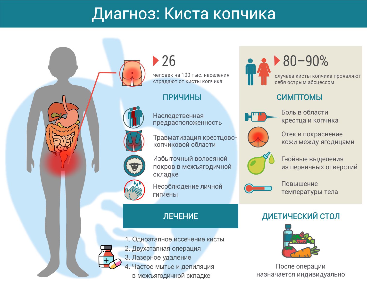 Люди с кистой копчика обычно не имеют каких-либо симптомов в течение жизни. Однако при наличии определенных факторов и снижении иммунореактивности организма может развиться воспалительный процесс. Такими провоцирующими моментами являются:
