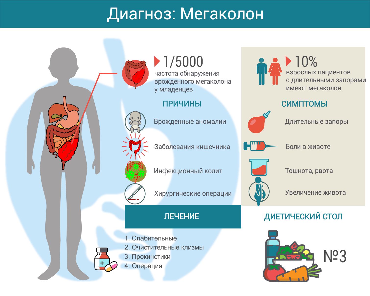 Приобретенный мегаколон лечат консервативно или хирургическим путем. Как правило, начинают с терапевтических мероприятий, направленных на устранение запоров и нормализацию деятельности кишечника: