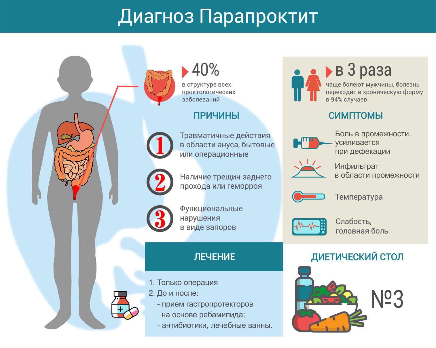 Прямая кишка не находится «в пустоте», а окружена жировой и соединительной тканью – клетчаткой. Парапроктитом называется состояние, когда в клетчатке вокруг прямой кишки развивается воспаление. Это очень распространенное заболевание, занимающее до 40% в структуре всех патологий прямой кишки. Мужчины болеют в три раза чаще женщин. Примерно у 10% пациентов острый парапроктит переходит в хроническую форму.