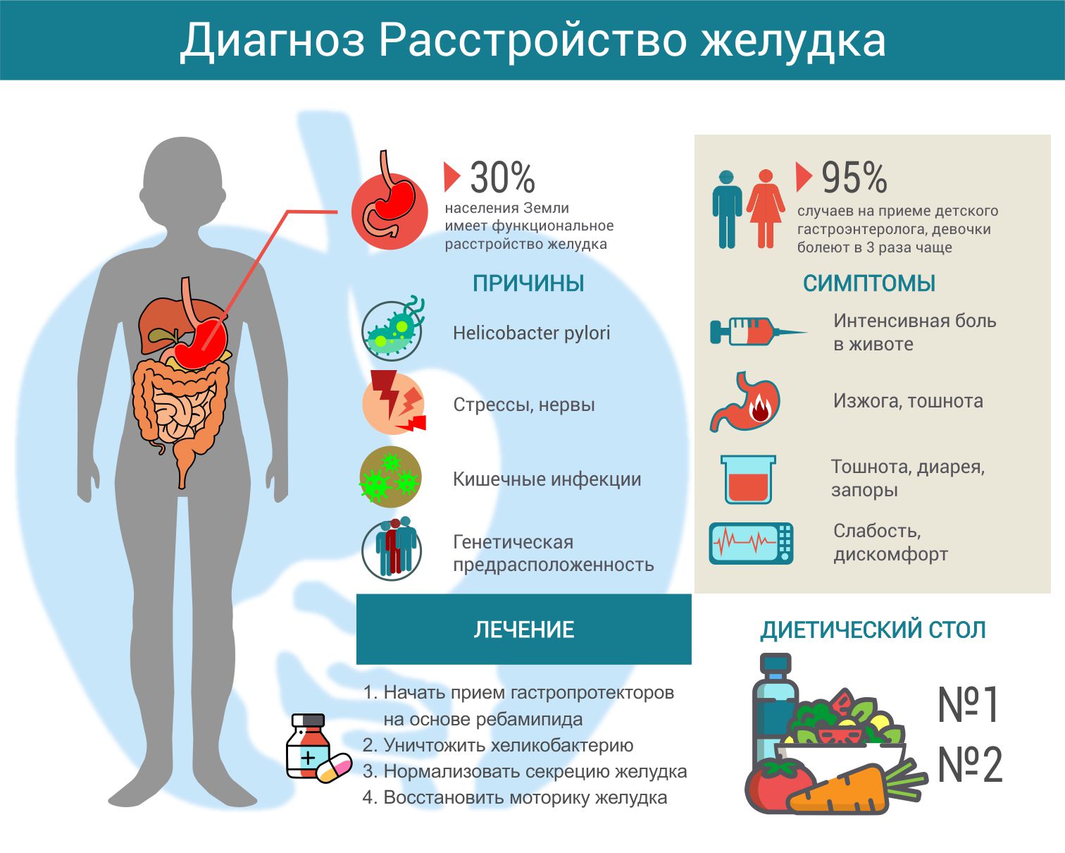 Кроме того, у большинства пациентов с функциональными расстройствами желудка отмечается высокий уровень невротизации, тревожных, депрессивных расстройств. Пусковым фактором появления жалоб обычно становится стресс.