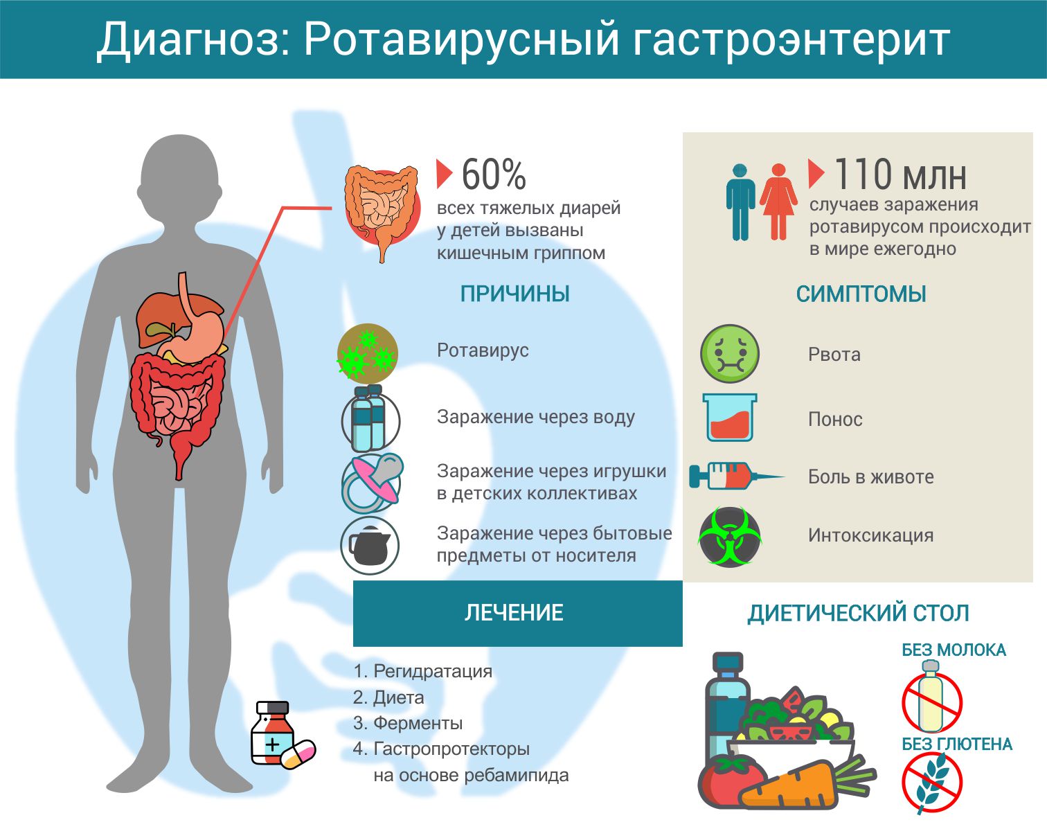 Каждый год в мире случается более 110 млн заражений ротавирусным гастроэнтеритом [1] или, как его еще называют, кишечным гриппом. По данным ВОЗ, это причина до 60% случаев острой тяжелой диареи (поноса) у детей до 5 лет [2].